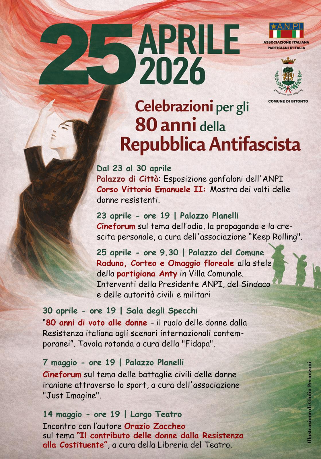 Il corteo è il momento centrale del calendario di eventi (consultabile in allegato), che ANPI e Comune di Bitonto hanno programmato in occasione della Festa della Liberazione 2026.